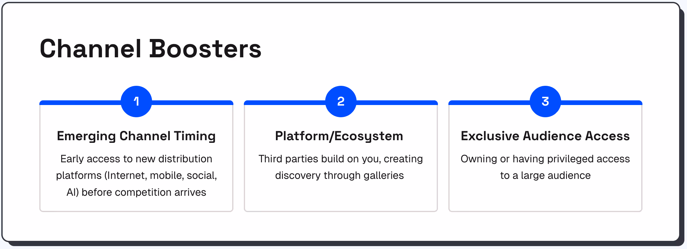 The next category, and to wrap up the connection to the Foundational Five, is our channel boosters. Meaning you have some sort of asymmetric or unfair distribution edge.