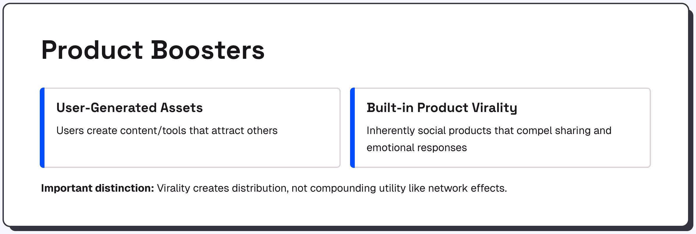 That makes built-in virality powerful but fragile: it can generate early momentum, but it rarely sustains long-term defensibility without being paired with deeper flywheels like network effects.