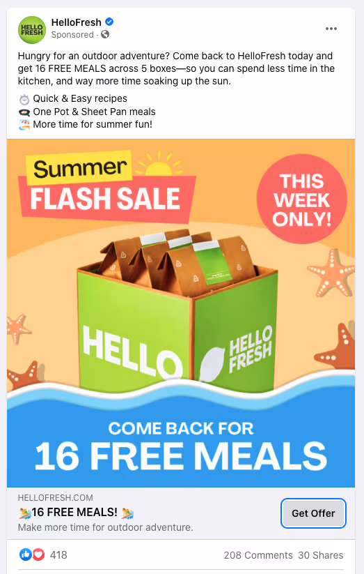 A bright, colorful summer theme ties the ad together and grabs users’ attention, with HelloFresh’s product displayed front and center.