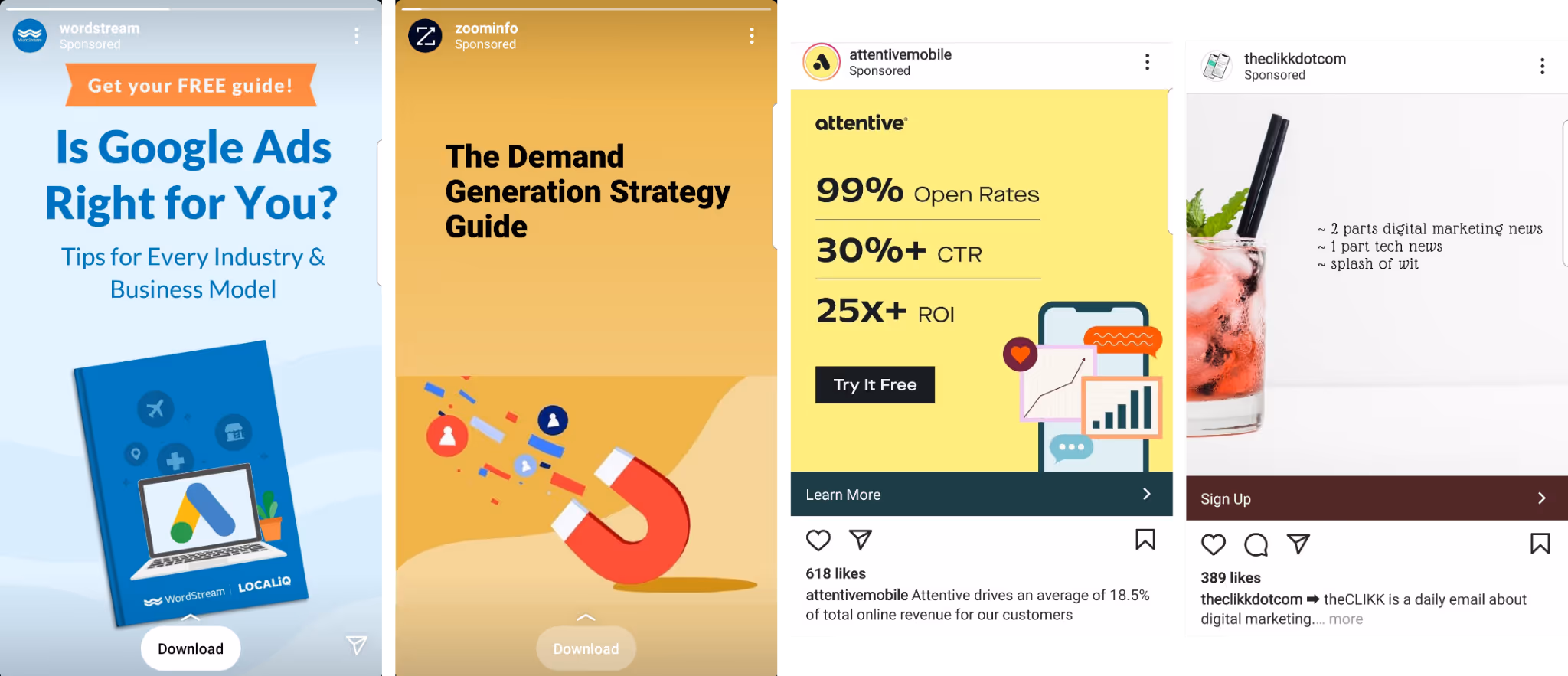 Watch out for the CTA button at the bottom of Stories. Ideally your captions are very clear and don’t overlap with this button, as they do in ClickUp’s ad.