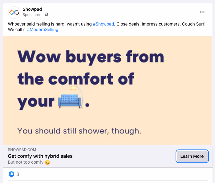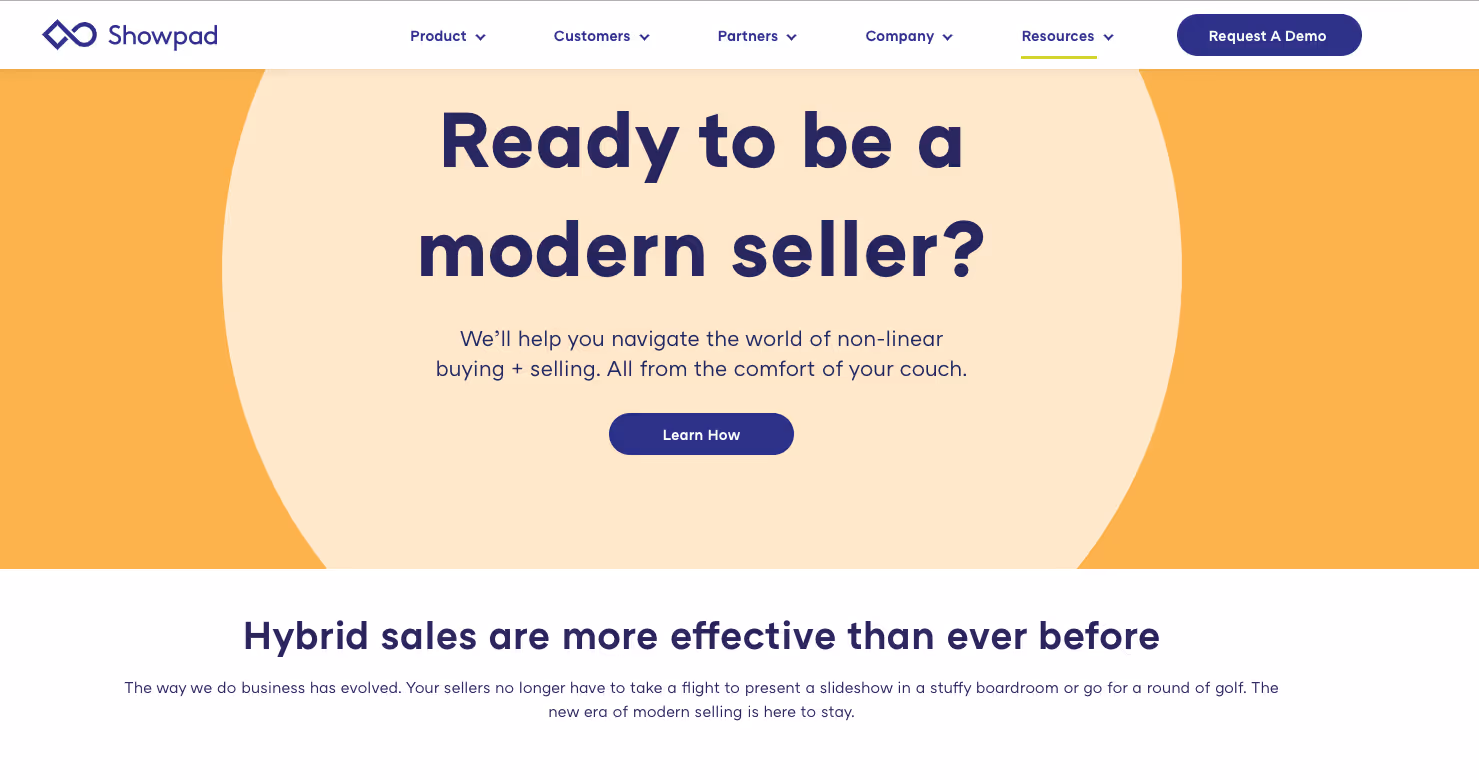 The ad leads to a landing page designed to educate users about hybrid sales. It’s a lot more informative than Showpad’s homepage, which features company logos and customer testimonials—elements that build social proof but don’t fully explain what Showpad does.