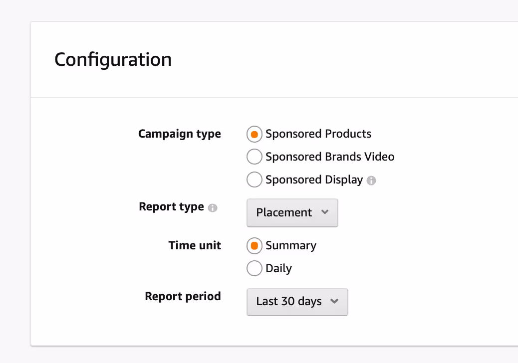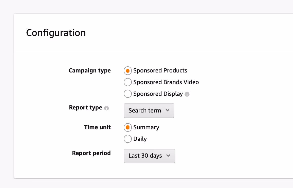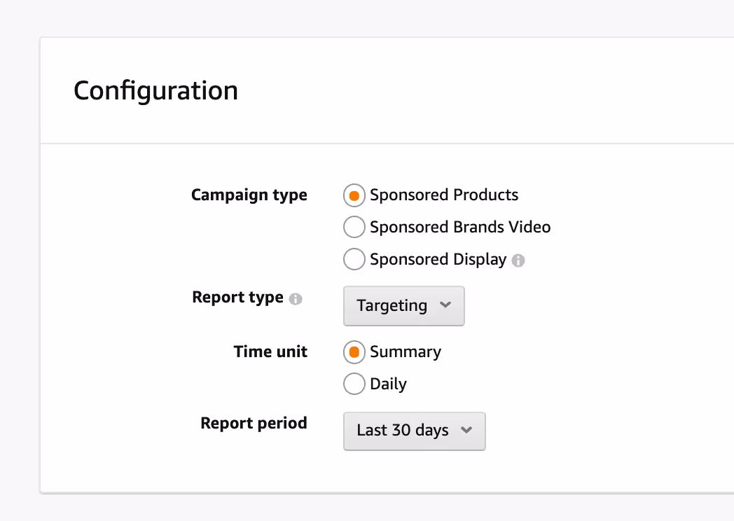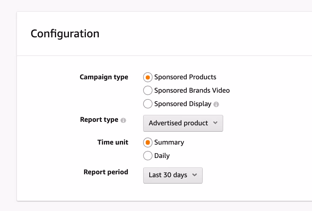 You can generate reports by campaign by clicking on the Reports button on the left tab of Amazon Advertising. Because we recommend putting most of your budget behind sponsored product ads, the following are all sponsored product reports, although you’ll find overlapping or similar reports for brand and display ads.