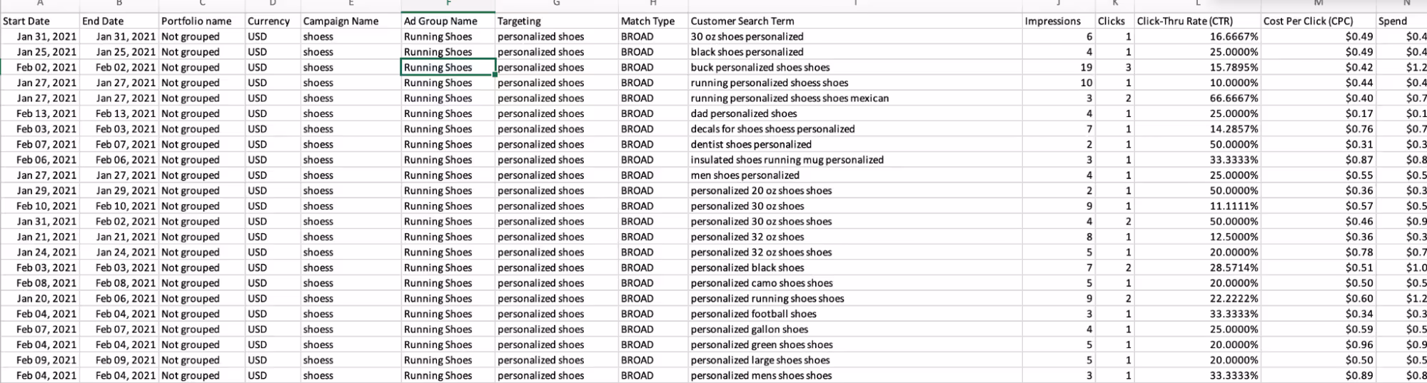 Metrics/elements tracked include: customer search terms, impressions, clicks, CTR, CPC, spend, ACOS, CVR