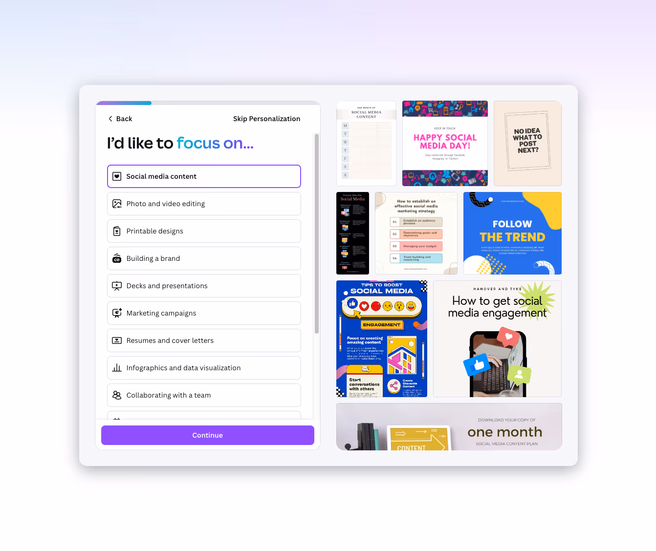 Now they ask what you want to create so they can show you templates specifically for that. Notice how as you switch what your focus is, it changes the example images on the right.