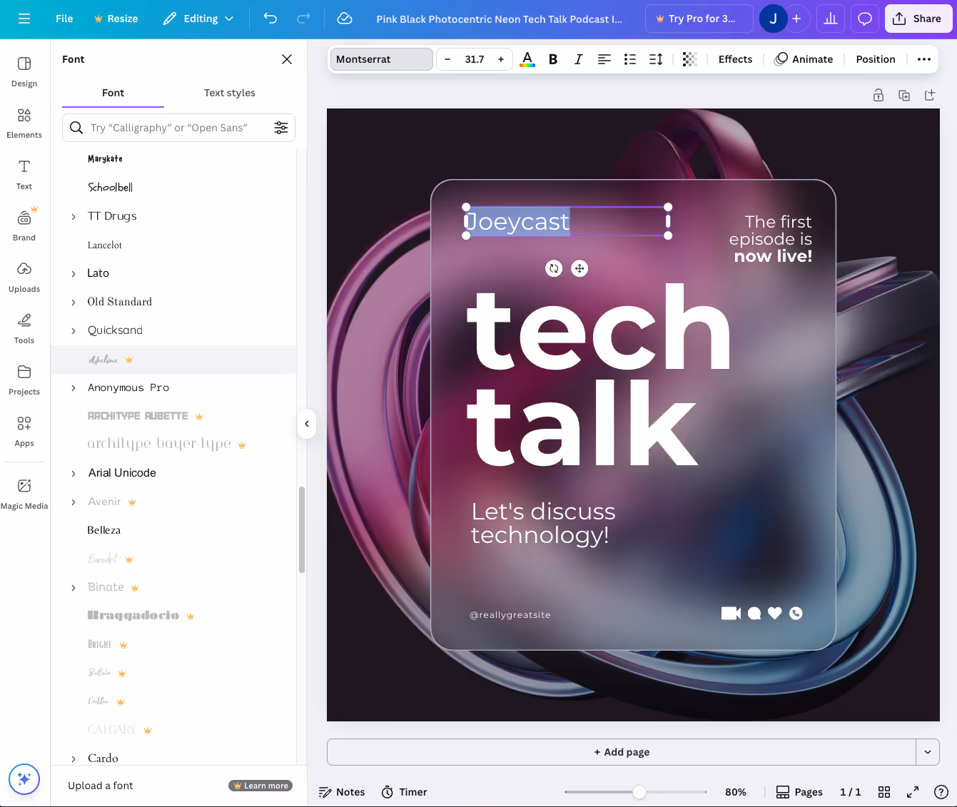Now that I’ve started designing, I want to change my font. But notice how they gate all the non-standard fonts. Again teasing me to upgrade to pro. But for now I choose a free font and carry on.