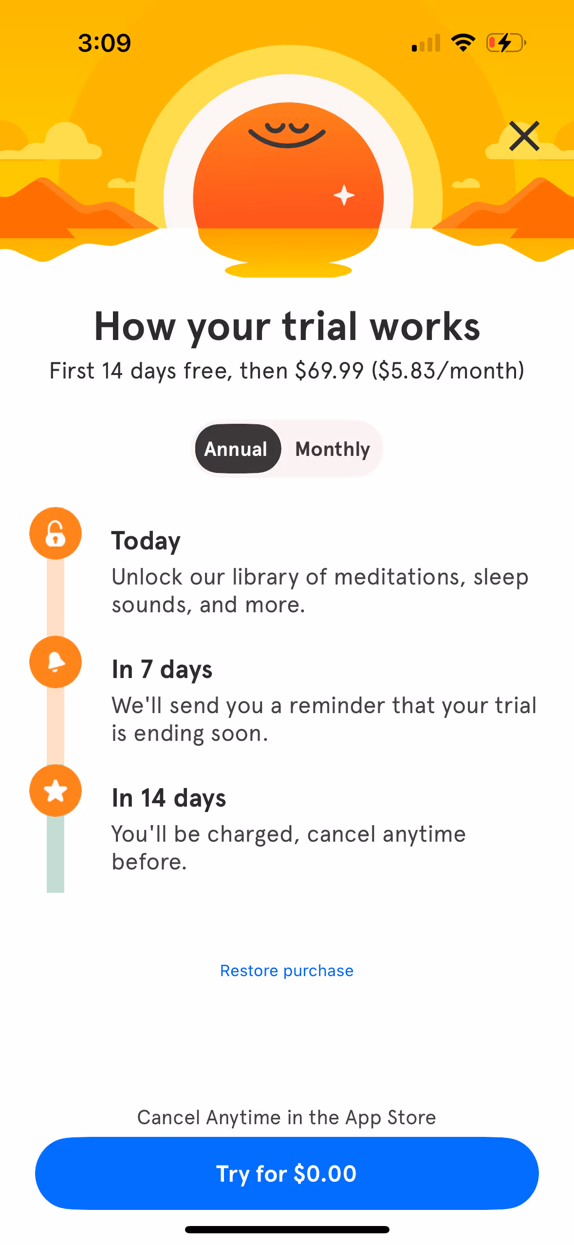 Headspace has to be a bit more strategic with their onboarding since they can’t show value until after you’ve signed up for the free trial. I think what they do is pretty cool. To start, the first screen you see is this animated Breathe in, Breath out effect. You already get a sense of calm when you first open the app.