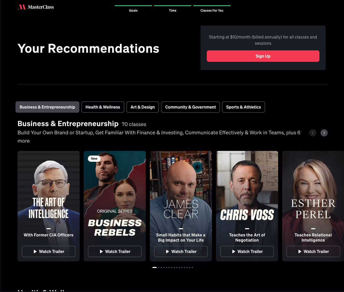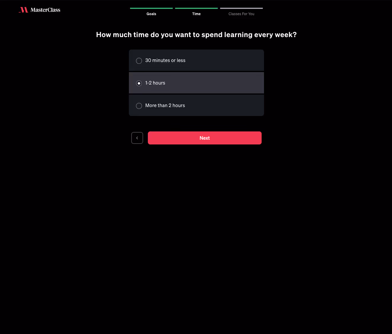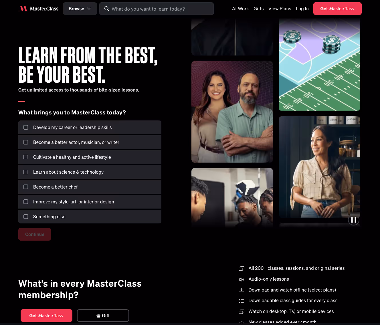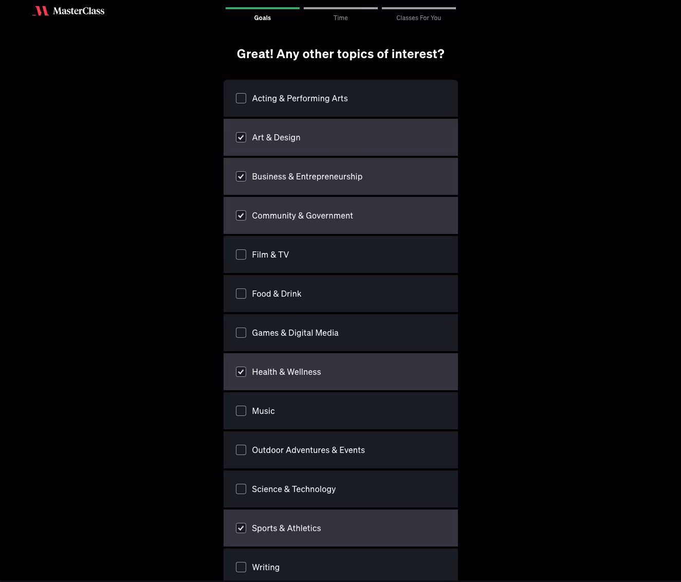 Here’s an example. On the MasterClass homepage, you’re immediately met with a personalized quiz asking what topics you want to learn.
