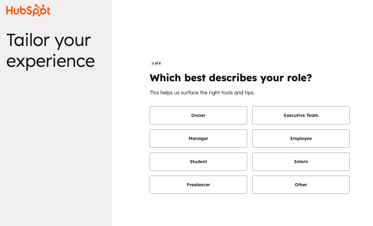 HubSpot needs to be strategic with onboarding since their full-featured hubs (Marketing, Sales, Service) only unlock for 14 days. The flow is designed to get you to an “aha” moment within minutes, not days.