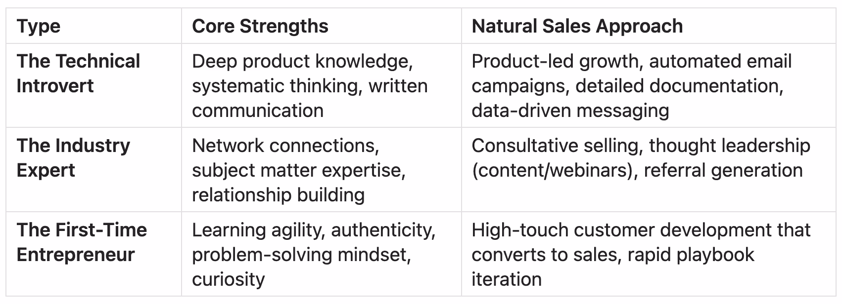 None of these founder sales types need to have a sales background. Instead, they built sales systems that used their natural strengths while learning specific skills to cover their weak spots.
