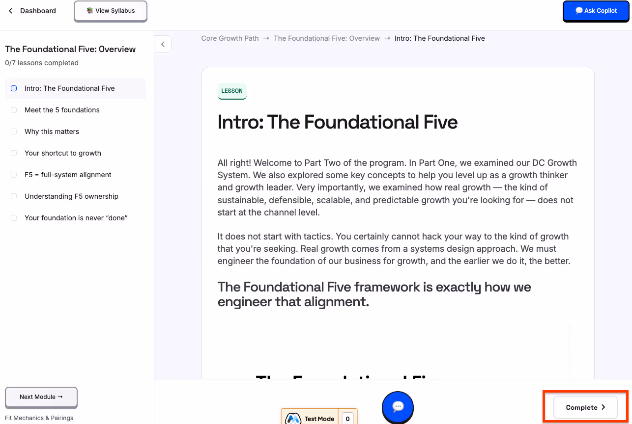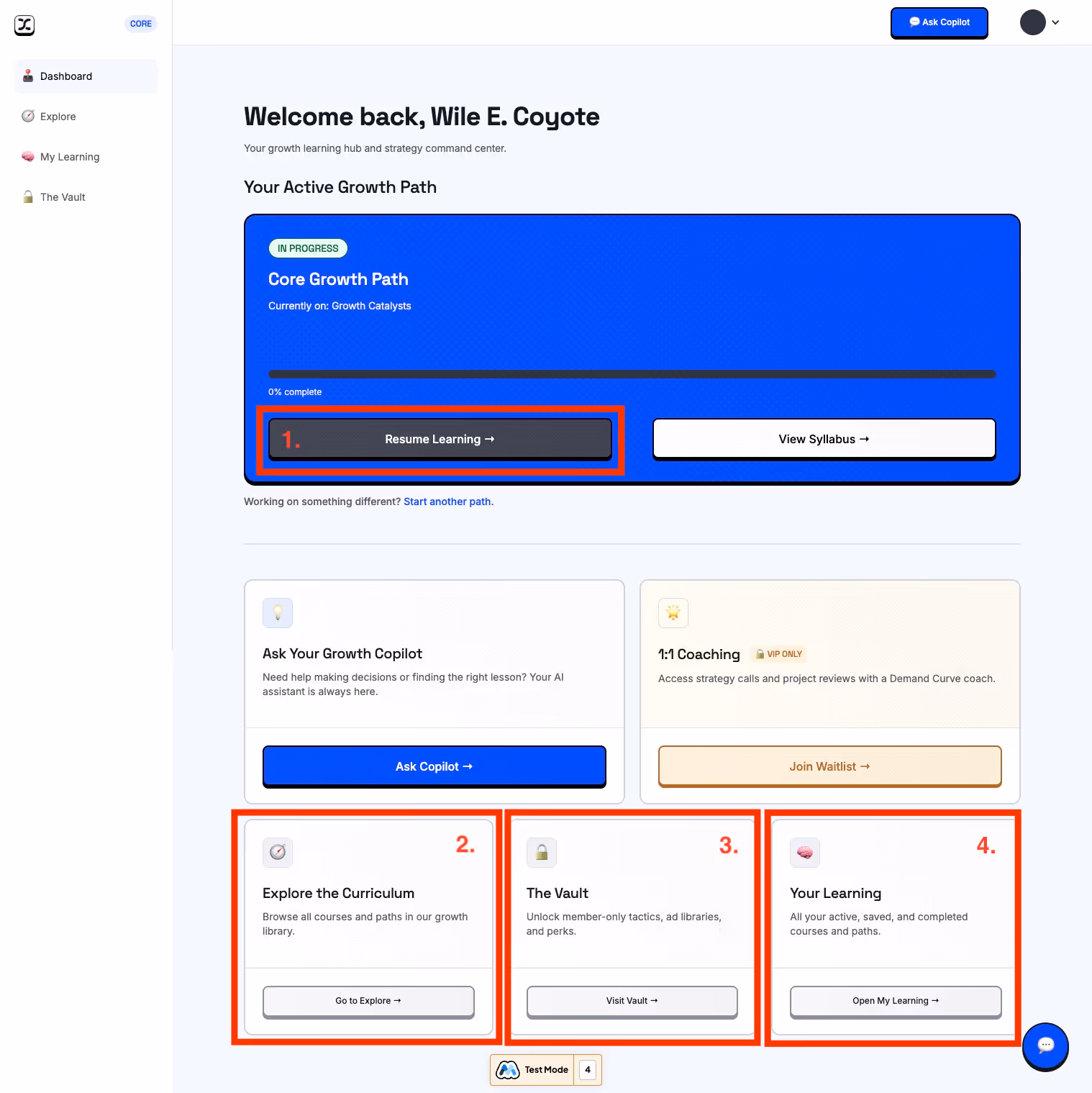 By now you’ve already gone through onboarding, chosen your company path, and started your first lessons. This guide will give you a quick tour of the platform so you always know where things live and how to get the most of the program.