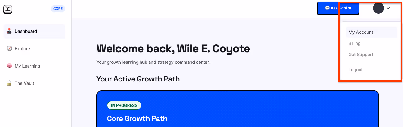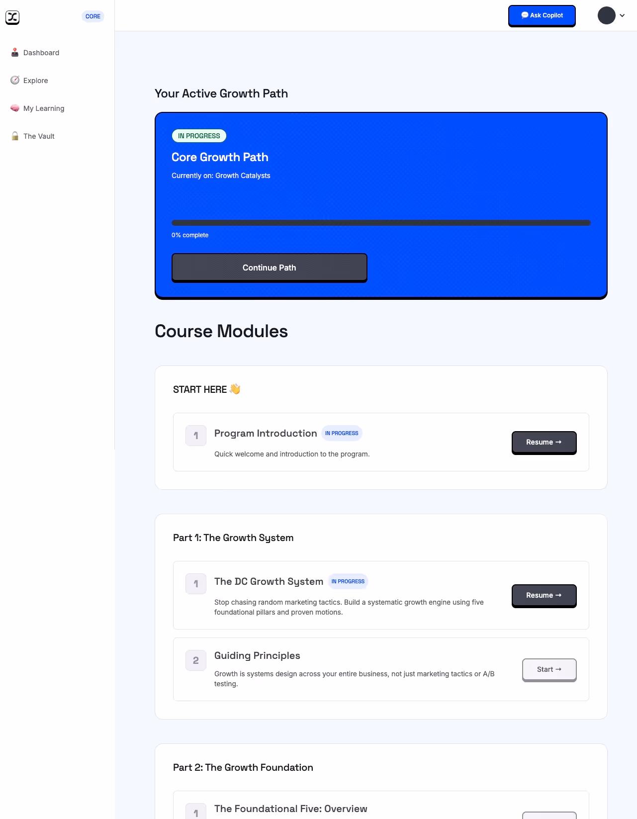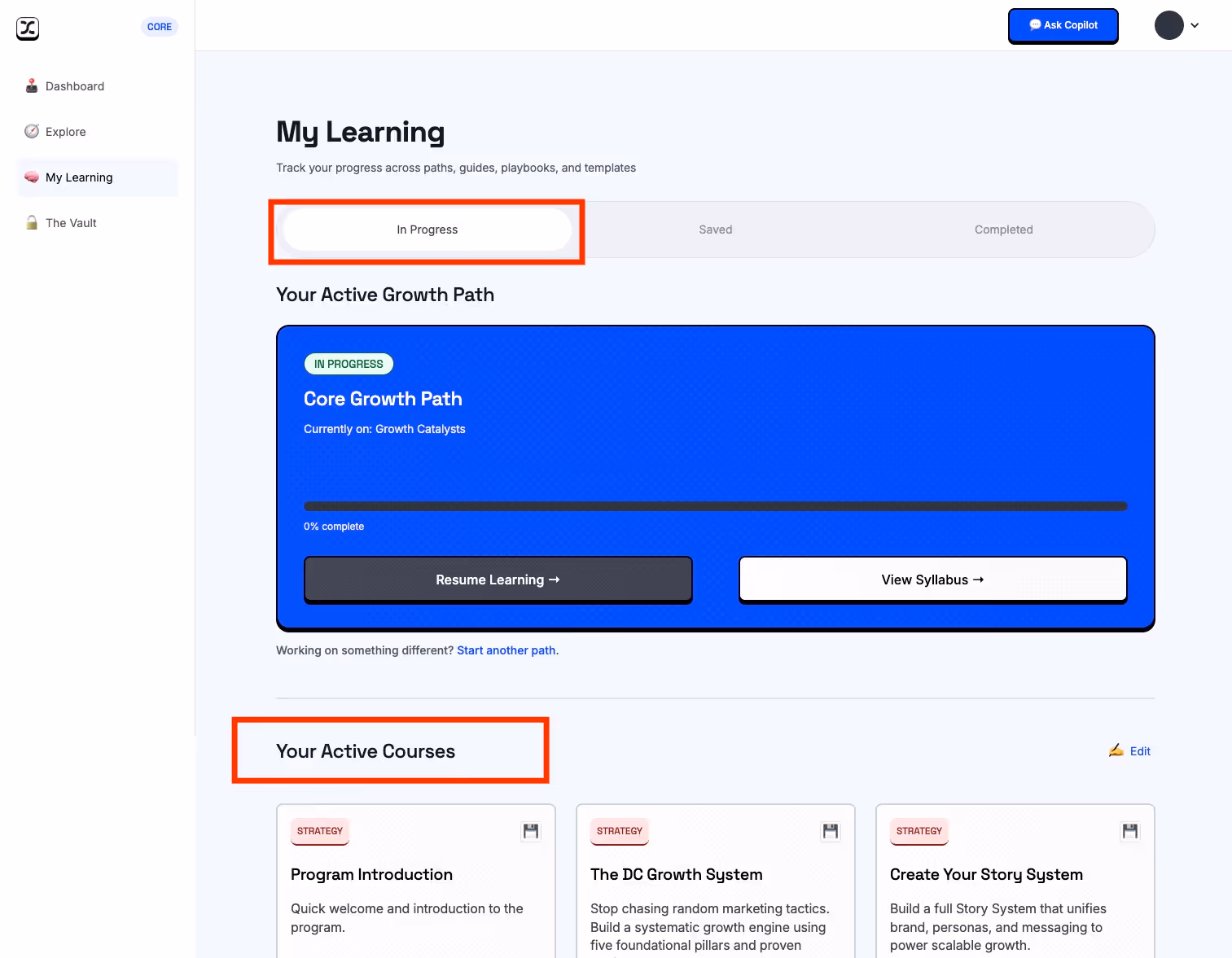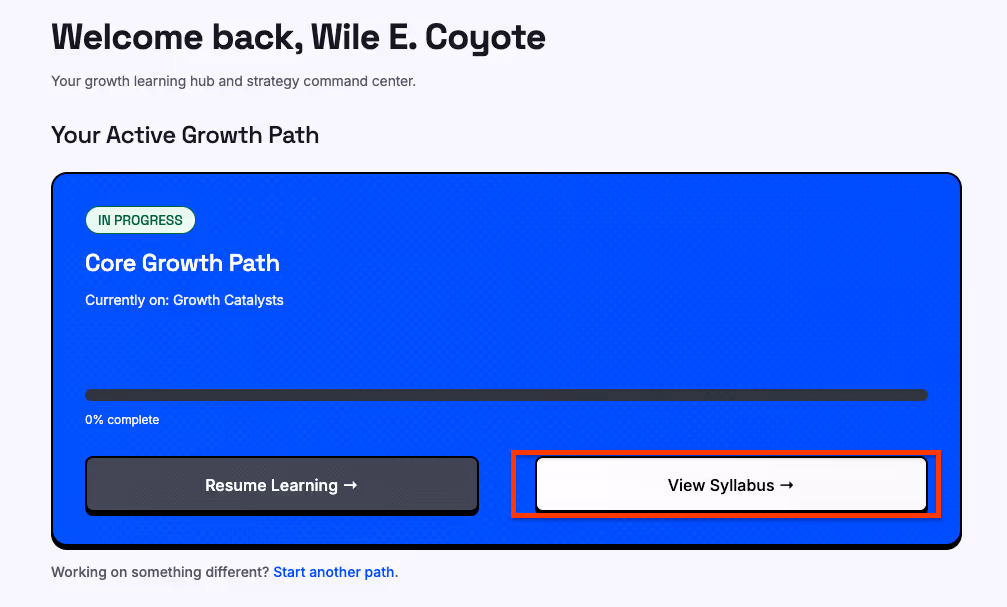 Jump into your active path. This keeps you moving forward in the structured plan we built for you during onboarding. (The Syllabus is where you can find the breakdown of courses inside your path.)