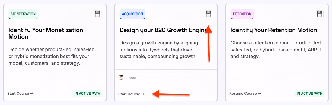 If it isn’t in your path, it will be blank, but you can enroll in any course you’d like with one click (Start Course). Once you enroll, progress counts toward your path (if it’s relevant), or you can simply save it for later by clicking the “Save” icon.