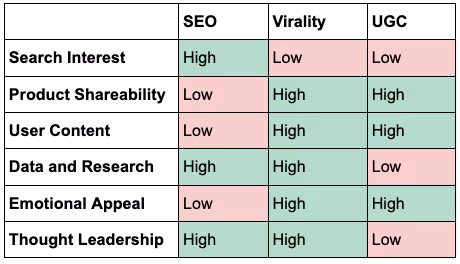 Your company may not perfectly align with a single strategy. In reality, many companies can find success with more than one strategy, not just exclusively SEO, virality, or UGC. Our scorecard is designed to help identify which strategy may have the most potential for success.